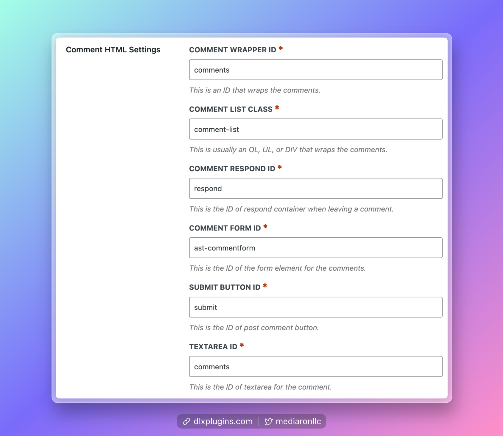 <figure><img src="https://3862281288-files.gitbook.io/~/files/v0/b/gitbook-x-prod.appspot.com/o/spaces%2FwIGhykuGfv38YJ8fAMWe%2Fuploads%2F1YxLMpiE4Hu6LKuYFian%2Fdlxplugins-1682961229079-1x.webp?alt=media&#x26;token=b70368e7-10ac-4bd2-8db9-d523261c84a5" alt=""><figcaption><p>Adding in Comment-Related HTML IDs and Classes</p></figcaption></figure>