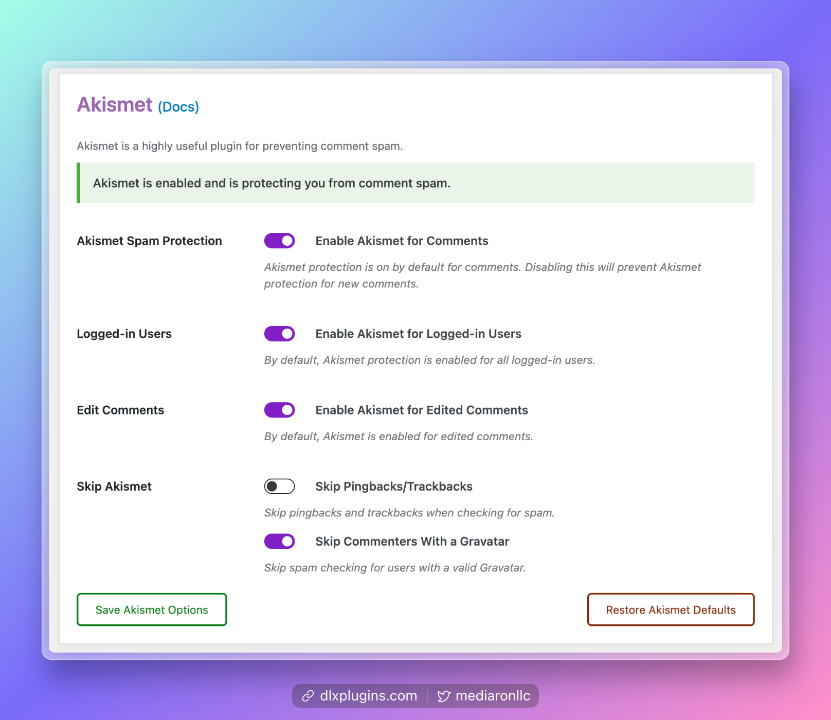 <figure><img src="https://3862281288-files.gitbook.io/~/files/v0/b/gitbook-x-prod.appspot.com/o/spaces%2FwIGhykuGfv38YJ8fAMWe%2Fuploads%2F4ylLX0hAxEo1boWyfP0m%2Fdlxplugins-1682960426771-1x.webp?alt=media&#x26;token=34dd661c-b307-4db5-9448-6945afe98c52" alt=""><figcaption><p>Akismet Admin Options</p></figcaption></figure>