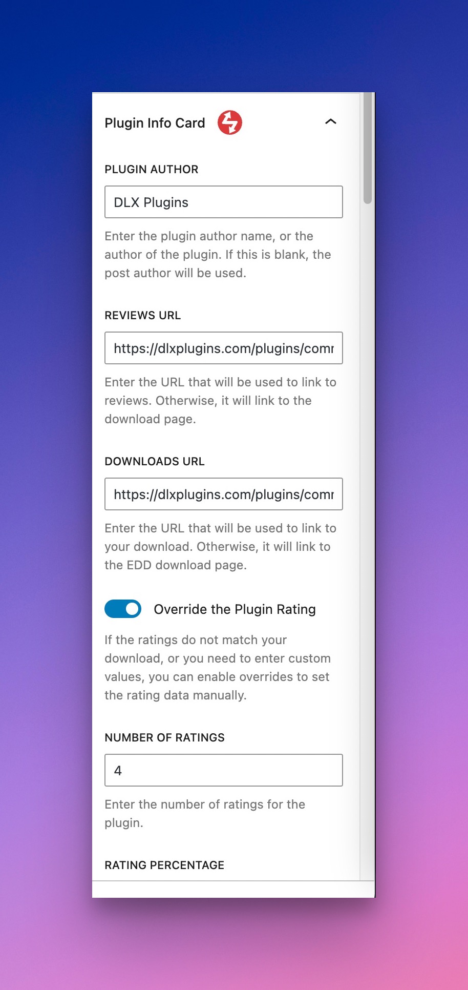 You'll find additional settings for the Plugin Info Card in the right sidebar. Make sure these are filled out for each download.