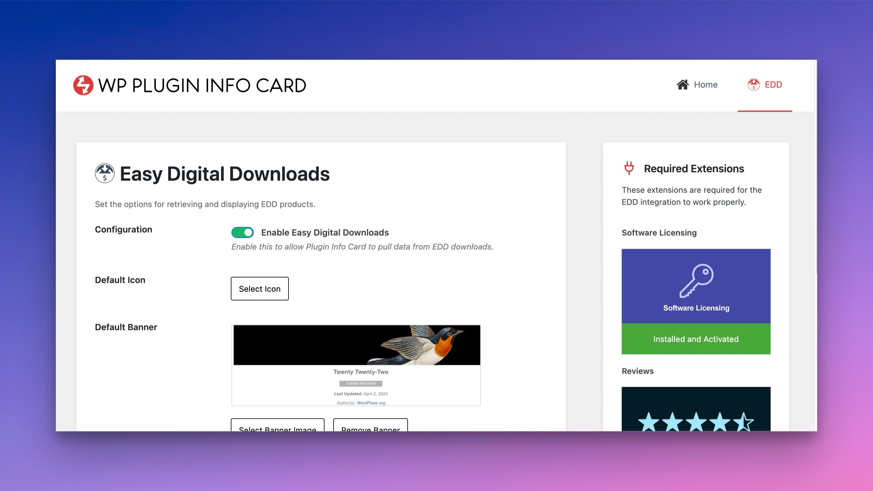 Head to the Plugin Info Card admin options and select the EDD tab.