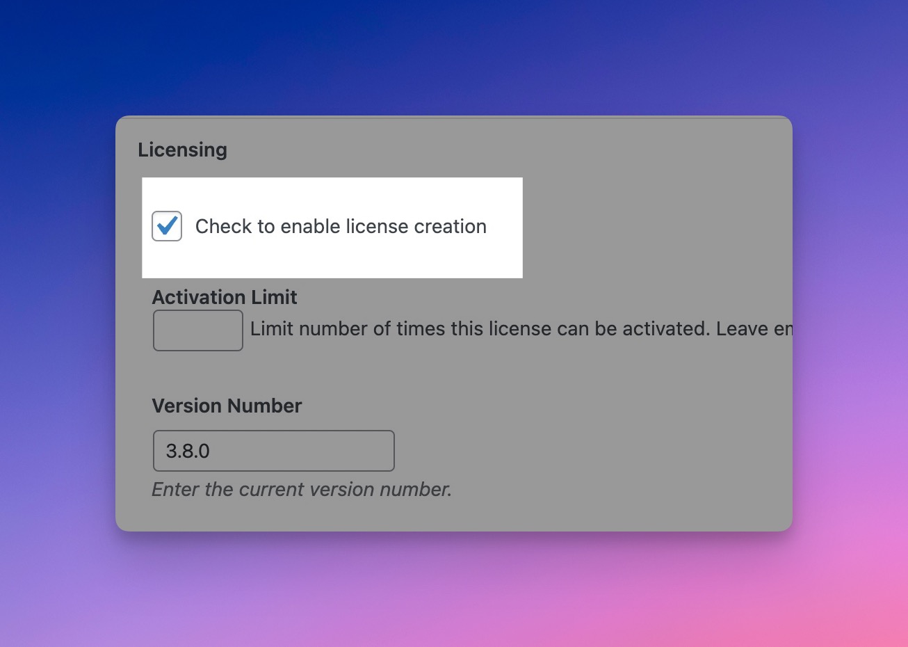 License creation must be enabled in order to sell your downloads. It is also required to show your plugins using the WP Plugin Info Card, as it enables extra fields for your plugin..